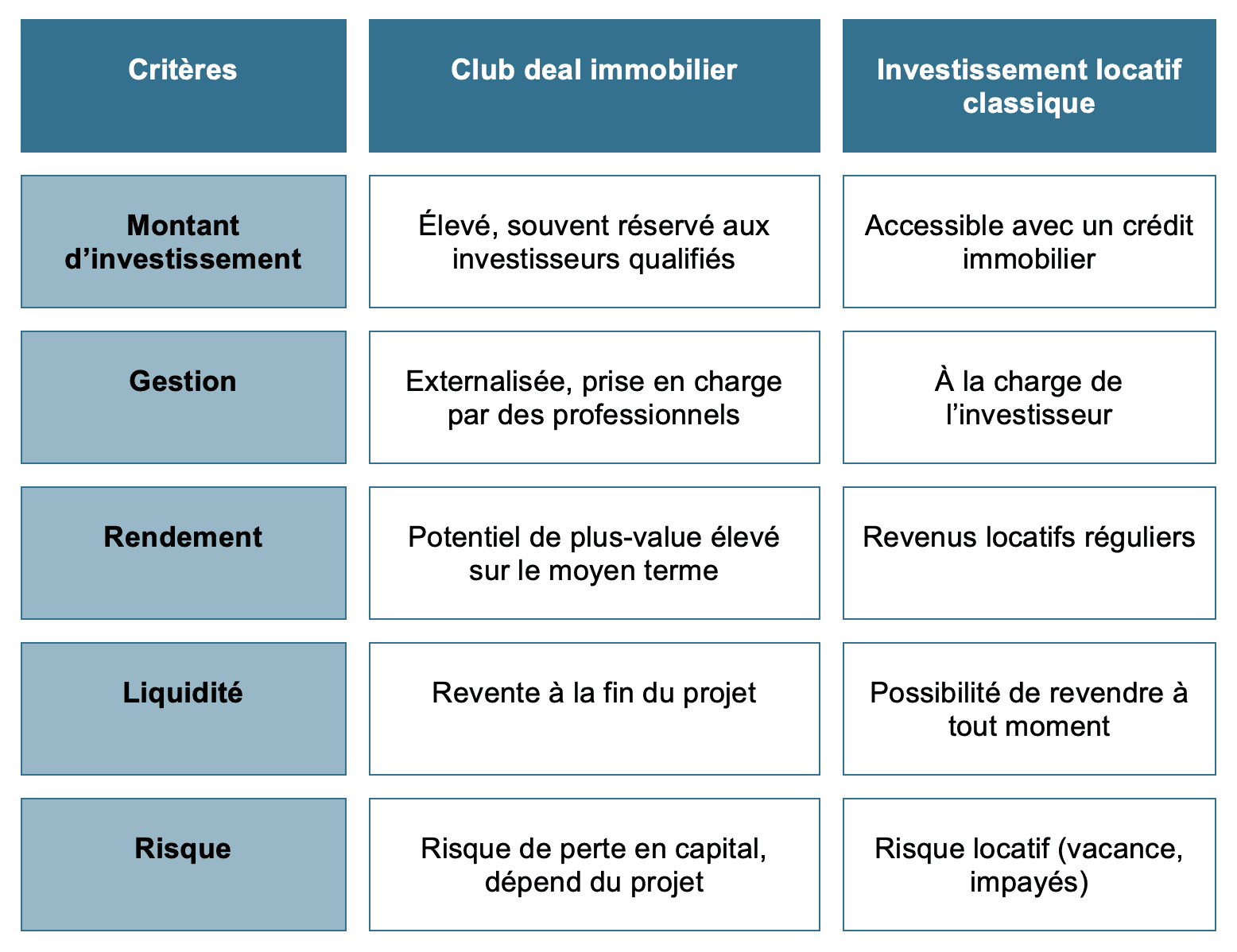 Le club deal convient aux investisseurs cherchant des opportunités à forte rentabilité, tandis que l’investissement locatif est plus adapté à ceux qui privilégient des revenus passifs stables.