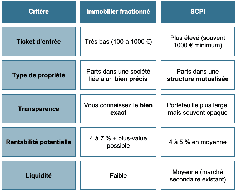 Les SCPI (Sociétés Civiles de Placement Immobilier) et l’immobilier fractionné ont un point commun :Ils vous permettent d’investir dans la pierre sans gérer vous-même le bien.