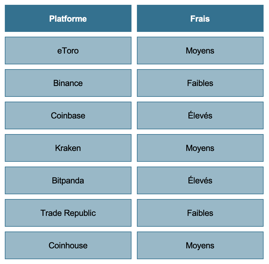 La plateforme Binance prend le moins de frais : 0,10% par transaction.